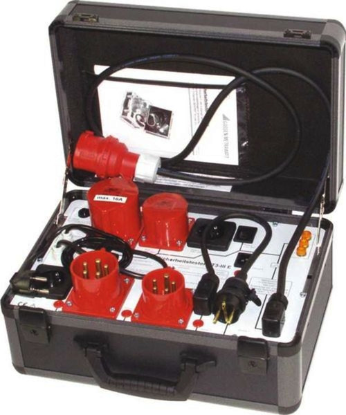 Adapter für aktive und passive Prüfung von Drehstromgeräten 16/32 A (max. 20 A) und Verlängerungsleitungen. Tragbarer Prüfgerätezusatz für die Sicherheitsmessungen an Drehstromverbrauchern mit automatischen Messablauf nach Norm.. Der mobile Adapter ist zum Messen und Prüfen von elektr. Geräten und Verlängerungsleitungen bestimmt. Prüfen von 1-und 3 phasigen Verbrauchern und Verlängerungsleitungen in Verbindung mit den externen Prüfgeräten SECUTEST ST PRO, SECULIFE ST BASE; BASE 25; PRO sowie der SECUTEST M7010 Serie wie z.B. SECUTEST S2N+; SIII+. Zusatzschutz bei der Prüfung defekter Prüflinge durch integrierte Differenzstromüberwachung mit Abschaltung Funktionsprüfung der Abschaltautomatik über eine Eigentest-Prüftaste Verhinderung von Kurzschlüssen und damit dem Ansprechen von Netzsicherungen mittels Vorprüfstufe automatische Anpassung an das eingestellte Programm des SECUTEST ST / SECULIFE ST Prüfgerätes mit Übergabe der Messwerte Prüfungen in Verbindung mit SECUTEST ST PRO, SECULIFE ST BASE; BASE 25; PRO Schutzleiterwiderstand, Isolationswiderstand, Schutzleiterstrom Berührungsstrom, Spannungsfestigkeit. 1 Prüfkoffer AT3-III E 1 Steckeradapter nach EN 60320 C13 zu C6 (Kaltgeräte 10 A zu 2,5 A-IBM-Stecker) 1 Bedienungsanleitung