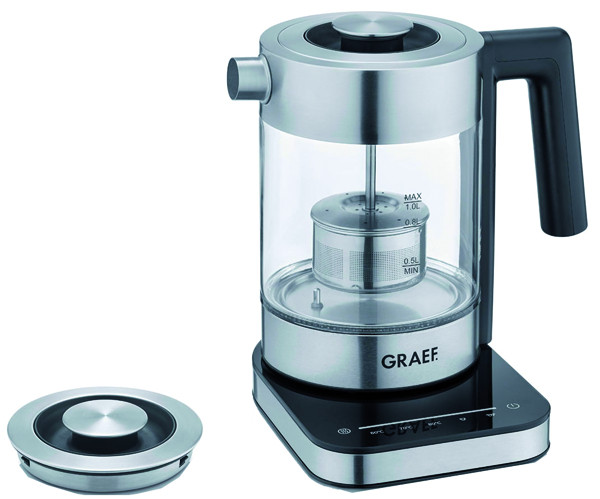 kabellos, 360°-Sockel, Temperatureinstellung (60/70/80°C, Filterkaffeefunktion +/-93°C & Kochen) über Touch-Display mit Restwärmeanzeige, 30 Min. Warmhaltefunktion, abwaschbarer Kalkfilter aus Edelstahl, abnehmbarer Deckel, zusätzlicher Deckel mit herabsenkbarem Teesieb aus Edelstahl, Füllmengenmarkierung, LED-Beleuchtung, Trockengeh-/Überhitzungsschutz, Glaskörper aus DURAN® Glas