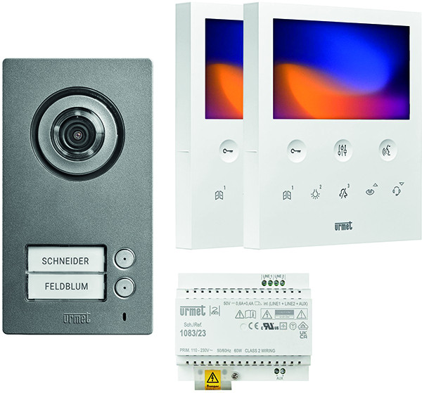 Zweifamilienhaus-Set Comfort. Dieses Set basiert auf der 2Voice Technologie und benötigt lediglich zwei Drähte vom Monitor bis zur Türstation. Die MIKRA 2 ist vandalensicher, dank einer Oberflächenlegierung aus ZAMAK. Sie haben mit diesem Set die Möglichkeit maximal vier Monitore parallel zu schalten, was es ihnen ermöglicht mehrere Bereiche im Haus mit weiteren Monitoren abdecken zu können. Sie können auch die Internkommunikation zwischen den Endgeräten programmieren, um eine effiziente interne Kommunikation zu ermöglichen. Darüber hinaus ist die Programmierung des Systems denkbar einfach gestaltet, um eine reibungslose Einrichtung zu gewährleisten.Set beinhaltet: 1x Aufputz-Türstation, Serie MIKRA, 1 Klingeltaster/Namensschild (mit LED-Beleuchtung) VT 1784/1, Art.-Nr. 75501, 1x Video-Bus-Netzgerät NG 1083/23, Art.-Nr. 74784, 2x Videomonitor VOG 5 VM 1760/6, Art.-Nr. 74722. Hinweis: Bitte nur hochohmige Türöffner oder Türöffner mit Arretierung einsetzen. (12 Ohm oder höher, z. B. TO 5111)