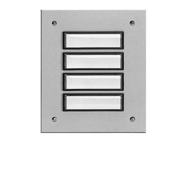 Aluminium, silber eloxiert, Unterputz-Montage, beleuchtbar, Anzahl Flächentaster siehe Bestellübersicht, incl. 1 Licht-Schild (rot), witterungsbeständig, Befestigungsbohrungen: jeweils 16 mm von Außenkante
