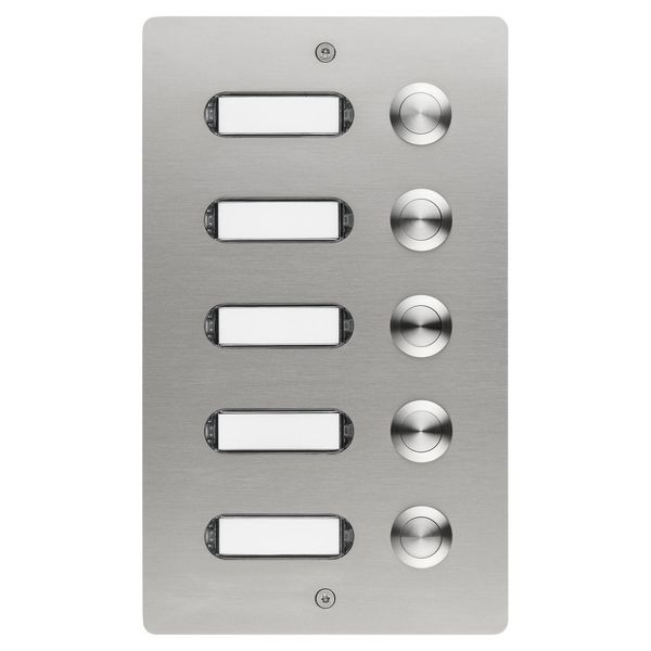 Die Funk-Etagenplatte V2A AP Batt 5WE ist die ideale Lösung für moderne Hauseingänge mit fünf Wohneinheiten. Mit ihrem gebürsteten Edelstahlfinish bietet sie ein elegantes u