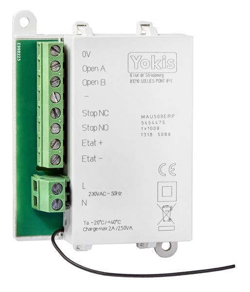 MAU500ERP(X) kann in verschiedenen Modi arbeite Ermöglicht die Steuerung von FAAC-Schiebe- und Drehtoren. Der YOKIS Master-Modus, der auch die Verwendung von YOKIS Fernbedienungen zur Steuerung von Toren und Türen ermöglicht. Die Verdrahtung erfolgt direkt auf der Platine des Motorsteuergeräts. Über die Yokis YnO App ist es möglich, den Status des Tores (offen/geschlossen) sowohl lokal als auch aus der Ferne zu überprüfen (erfordert YOKIS Hub).