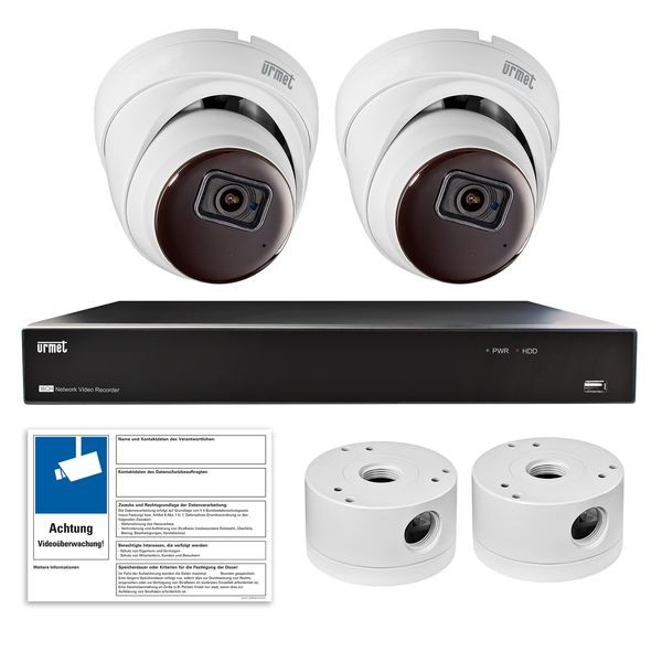 • Komplettsystem inkl.: 1 x Netzwerkvideorekorder 1098/324P, 2 x Videokamera 1099/550B, 2 x Verteilerdose 3000/108, DSGVO-konformer Aufkleber