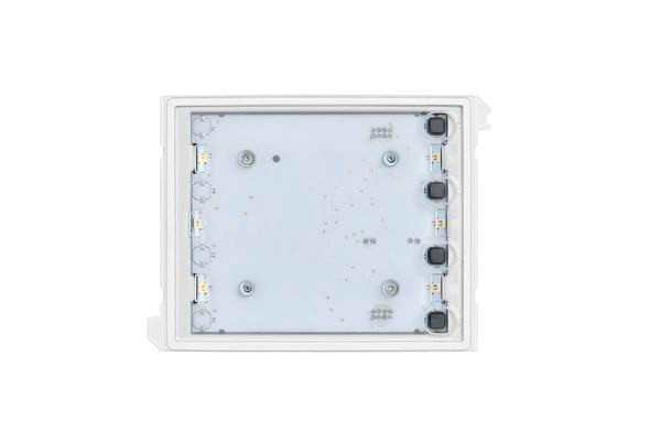 Dieses Modul ist mit vier Klingeltasten und Namensschildern ausgestattet, welche einreihig angeordnet sind und verfügt über eine LED-Beleuchtung für die Taster und Namensschilder. Die Montagezeit dieses Moduls ist gering, da es über ein Stecksystem und vorverdrahtete Flachkabel verfügt. Zusätzlich besitzt das Modul, sobald es mit einer passenden Abdeckung eingebaut ist, die Schutzart IP66 und IK08.