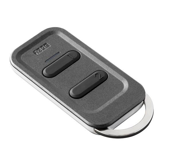 Flache Design-Fernbedienun mit 2 Tasten. Pro Kanal auf 4 Empfänger anlernbar mit Empfangsbestätigungsfunktion