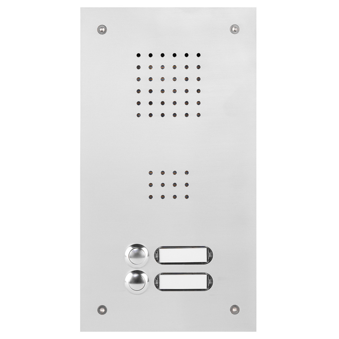 Die Serie ROBUSTA setzt auf hochwertige Eigenentwicklungen aus unserem Hause, darunter die PROTACT-Taster und das LED-beleuchtete Namensschild. Bei diesem Modell handelt es sich um eine bündig abschließende Unterputz-Audio-Türstation mit zwei Klingeltastern und zwei beleuchteten Namensschildern.