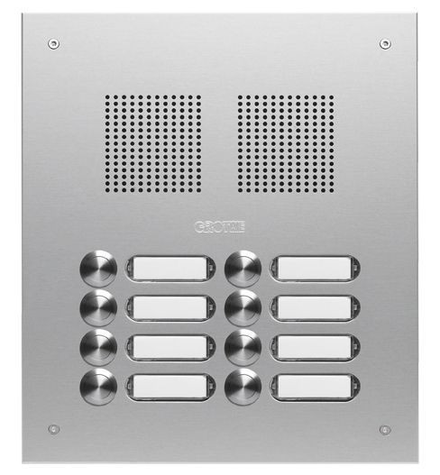 Die Serie ROBUSTA ist ausgestattet mit Eigenentwicklungen aus unserem Hause, wie z. B. den Tastern der Serie PROTACT oder dem LED-Namensschild. Bei diesem Artikel handelt es sich um eine bündig abschließende Unterputz-, Audio-Türstation mit insgesamt acht Klingeltastern und acht Namensschildern die zweireihig angeordnet sind. Der PROTACT Klingeltaster mit seiner taktilen Rückmeldung gibt Ihnen ein angenehmes Gefühl beim Betätigen und das Namensschild rundet visuell nochmals mit seiner LED-Beleuchtung die Front ab. Die 2,5 mm dicke Frontplatte ist aus Aluminium (Silber eloxiert), was der Türstation einen edlen Look verschafft. Neben dem verzinktem Unterputzkasten und den diebstahlsicheren Befestigungsschrauben, besitzt die ROBUSTA einen integrierten Lautsprecheradapter und bietet Ihnen zusätzlich so die Möglichkeit einen GROTHE Lautsprecher einzubauen. Der patentierte Lautsprecheradapter bieten mit den getrennten Kammern sowie dem Wasserableitsystem eine optimale Akustik und den besten Schutz gegen Witterungseinflüsse.