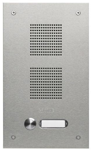 Die Serie ROBUSTA ist ausgestattet mit Eigenentwicklungen aus unserem Hause, wie z. B. den Tastern der Serie PROTACT oder dem LED-Namensschild. Bei diesem Artikel handelt es sich um eine bündig abschließende Unterputz-, Audio-Türstation mit insgesamt einem Klingeltaster und einem Namensschild. Der PROTACT Klingeltaster mit seiner taktilen Rückmeldung gibt Ihnen ein angenehmes Gefühl beim Betätigen und das Namensschild rundet visuell nochmals mit seiner LED-Beleuchtung die Front ab. Die 2,5 mm dicke Frontplatte ist aus Edelstahl (gebürstet), was der Türstation einen edlen Look verschafft. Neben dem verzinktem Unterputzkasten und den diebstahlsicheren Befestigungsschrauben, besitzt die ROBUSTA einen integrierten Lautsprecheradapter und bietet Ihnen zusätzlich so die Möglichkeit einen GROTHE Lautsprecher einzubauen. Der patentierte Lautsprecheradapter bieten mit den getrennten Kammern sowie dem Wasserableitsystem eine optimale Akustik und den besten Schutz gegen Witterungseinflüsse.