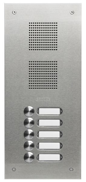 Die Serie ROBUSTA ist ausgestattet mit Eigenentwicklungen aus unserem Hause, wie z. B. den Tastern der Serie PROTACT oder dem LED-Namensschild. Bei diesem Artikel handelt es sich um eine bündig abschließende Unterputz-, Audio-Türstation mit insgesamt fünf Klingeltastern und fünf Namensschildern. Der PROTACT Klingeltaster mit seiner taktilen Rückmeldung gibt Ihnen ein angenehmes Gefühl beim Betätigen und das Namensschild rundet visuell nochmals mit seiner LED-Beleuchtung die Front ab. Die 2,5 mm dicke Frontplatte ist aus Edelstahl (gebürstet), was der Türstation einen edlen Look verschafft. Neben dem verzinktem Unterputzkasten und den diebstahlsicheren Befestigungsschrauben, besitzt die ROBUSTA einen integrierten Lautsprecheradapter und bietet Ihnen zusätzlich so die Möglichkeit einen GROTHE Lautsprecher einzubauen. Der patentierte Lautsprecheradapter bieten mit den getrennten Kammern sowie dem Wasserableitsystem eine optimale Akustik und den besten Schutz gegen Witterungseinflüsse.