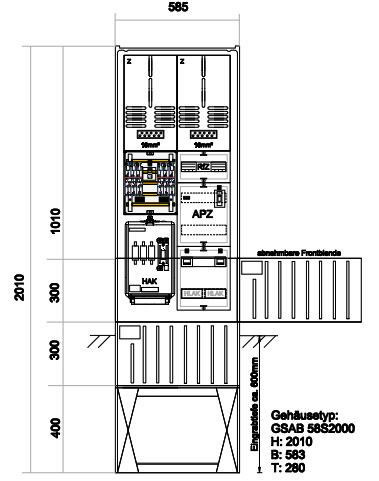 GSAB-Säulenprogramm – Zähleranschlusssäule mit APZ und RfZ für steuerbare Verbraucher. Gehäuse mit Eingrabsockel aus heißgepresstem, hochschlagfestem, wärmebeständigem, selbstverlöschendem, halogenfreiem, verrottungsfestem, glasfaserverstärktem Polyester (SMC), beständig gegen chemische Einwirkungen, durchgefärbt ähnlich RAL 7035 grau. Gehäuse und Sockel bilden eine Einheit. Der Sockelfuß ist als Platte ausgebildet und sorgt damit für sofortige Standsicherheit beim Aufstellen im Kabelgraben. Zwei durchlaufende Befestigungsleisten mit 210 Befestigungspunkten bis in den Sockelbereich ermöglichen die individuelle Befestigung von Geräten, einer Kabelabfangschiene sowie der Montageplatte. Ausgestattet mit einer Tür, 3-Punkt-Stangenschloss mit Doppelschließanlage. Ein Profilzylinder ist eingebaut sowie ein Platz für den Profilzylinder des Netzbetreibers vorgesehen. Das waagerecht eingebaute Schließsystem ermöglicht einen werkzeuglosen Türanschlagwechsel. Bei Doppelschließsystem erfolgt die Verriegelung mit einem Profilzylinder unabhängig vom zweiten. Eine Wetterschutzabdeckung der Profilzylinder aus besonders verstärktem Zinkdruckguss verhindert Vandalismusschäden. Material: glasfaserverstärktes Polyester (SMC) nach IEC-695-2-1, halogenfrei. Maße: Höhe 2010 mm mit Sockel (Eingrabtiefe ca. 600 mm), Breite 585 mm, Tiefe 280 mm. Schutzart: IP44. Ausführung gemäß TAB (oder TAB-gleiche Stadtwerke) für Zähler ohne TSG-Feld. Bestückt mit: Hausanschlusskasten 3x NH00 oder vorbereitet für HAK, Sammelschienensystem 250A (nAR), vorbereitet zum Einbau von SH-Schaltern, Spannungsversorgung B10/25kA 1pol (plombierbar) für RfZ auf Buchsenstecker, 4-Leiter-Verdrahtung (TT-Netz) mit H07V-K 16mm², Zählerfelder für Dreipunktbefestigung 450x250 mm, 1x RfZ-Feld 150x250 mm unbestückt, 1x APZ-Feld 300x250 mm (plombierbar) inkl. Spannungsversorgung, anlagenseitiger Anschlussraum (aAR) 300x250 mm, Hauptschalter 63A , HLAK 25mm². Bezugsquelle: www.gsab.de, E-Mail: vertrieb@gsab.de, Tel: 03636-76140. Separat zu bestellen: Sockelfüllmaterial (Blähtonkugeln), Gitterbodenplatte mit Erdungsschraube (nur erforderlich bei Nutzung für Erdung), siehe Zubehörliste.