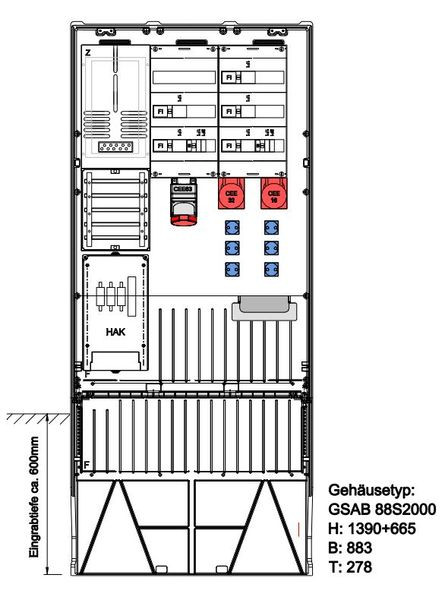 | Kurzbeschreibung | Zähleranschlußsäule (1Zähler) als Festplatzverteiler mit CEE63+32+16+6xSchuko+ Reserve |