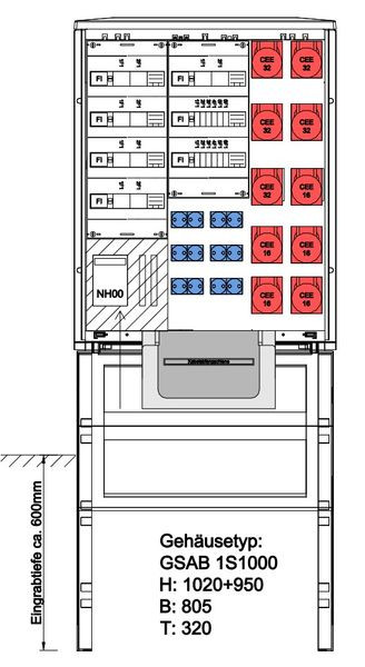| Kurzbeschreibung | Festplatzverteiler HxBxT:1000x805x320mm best.mit 5xCEE32,5xCEE16,12xSchuko |
