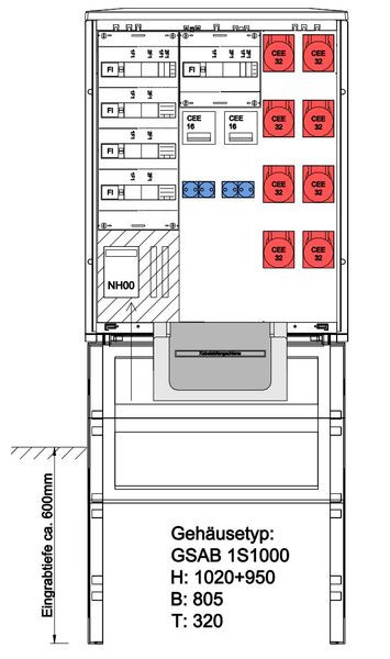 | Kurzbeschreibung | Festplatzverteiler HxBxT:1000x805x320mm best.mit 8xCEE32,2xCEE16,4xSchuko |