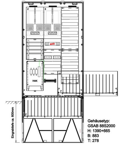 | Kurzbeschreibung | Zähleranschlusssäule Netze BW (2Zähler/ohne TSG), HAK mit Verteiler 8x12TE |