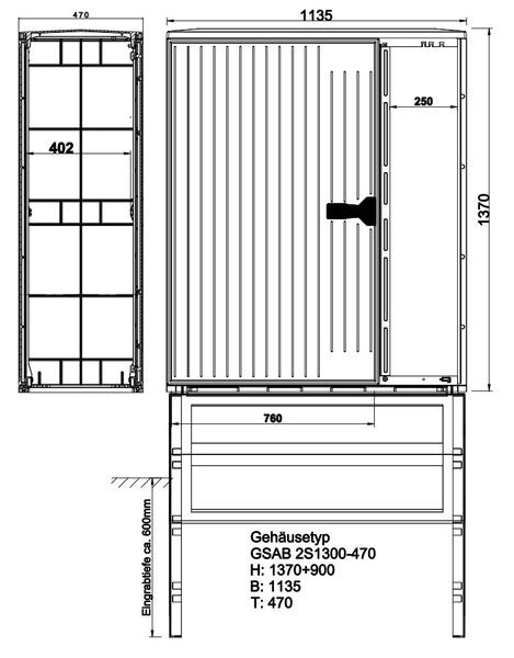 | Kurzbeschreibung | Kabelverteilerschrank HxBxT:1300x1135x470 2/3-1/3-Tür jew. mit Einfachschwenkhebel |