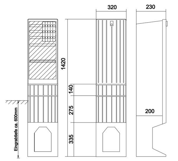 | Kurzbeschreibung | Verteilersäule 1420 hoch, 320 breit Direktabgang 5xD02 Reitersicherungssockel 3-pol. |