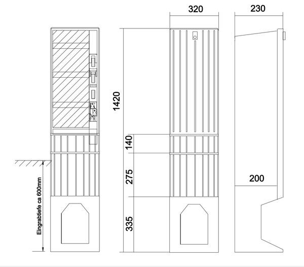| Kurzbeschreibung | Verteilersäule mit Sockel HxBxT:1420x320x234, mit Sammelsch.185mm 1xNH00 Lastschaltleiste+Reserv. |