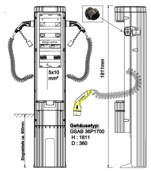 | Kurzbeschreibung | Ladesäule rund, glasfaserverstärkt. Polyester mit Sockel, 2x11kW, 2x RFID-Leser 2x angeschlag. Typ2-Spiralkabel |