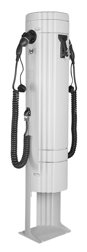 Ladesäule rund, glasfaserverstärkt. Polyester mit Sockel, 2x22kW, Schlüsselschalter 2x angeschlag. Typ2-Spiralkabel 6mm²
