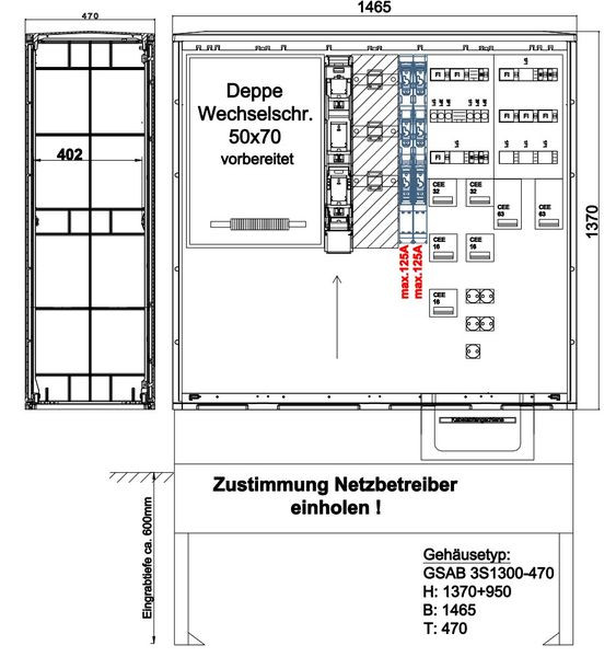 | Kurzbeschreibung | Festplatzverteiler 470tief mit VNB-Wandlermess-ZWS,best.2xCEE63+3xCEE32+3xCEE16+Schuko,mit FP-Einf. |