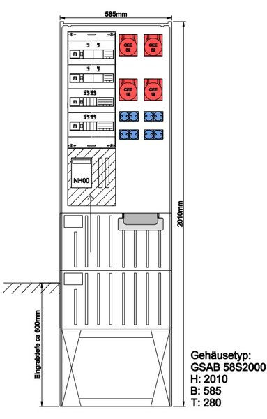 Festplatzverteiler mit Sockel HxBxT:2010x583x280 mit NH00,2xCEE32,2xCEE16,8xSchuko inkl. FP-Einf.