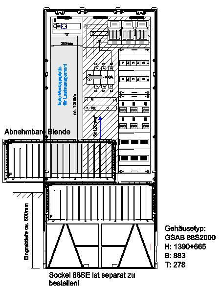 | Kurzbeschreibung | Verteilersäule für Emobility H:1390 x B:883 x T:278mm für 6x22KW Abgänge |