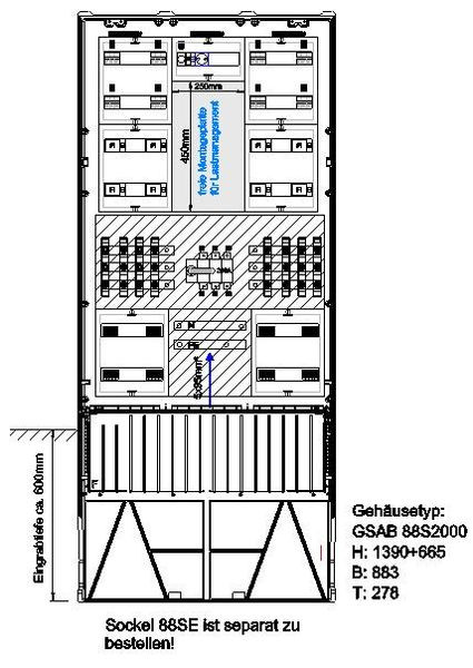 | Kurzbeschreibung | Verteilersäule für Emobility H:1390 x B:883 x T:278mm für 8x11KW Abgänge |