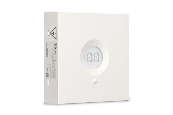 Quadratische Sicherheitsleuchte in minimalistischem Design. Anschluss- und montagefreundliches Kunststoffgehäuse in Verkehrsweiß, RAL 9016.