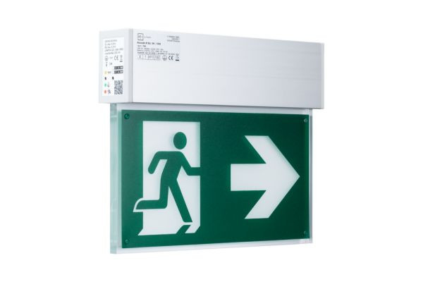 Leuchtmittel (LED) in augenfreundlicher, neutralweißer Lichtfarbe (4000K; 840). Homogene, normkonforme Ausleuchtung der Piktogramme durch lichttechnisch optimierte Acrylglasscheibe. Das Piktogrammset (unten, rechts, links, oben), zur ein- oder zweiseitigen Fluchtwegkennzeichnung, gehört zum Standard-Lieferumfang.