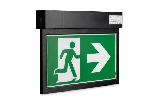 Moderne, unauffällige und ästhetische Rettungszeichenleuchte Unlimited, im Polycarbonatgehäuse in Verkehrsschwarz, RAL 9017. Dank Universalmontage, ohne weiteres Zubehör, an Wand oder Decke montierbar. Sie bestimmen (auch noch vor Ort), wo die Leuchte befestigt wird. Ohne Werkzeug einrastbares Leuchtenmodul, vollständig mit allen elektrischen Betriebs- und Leuchtmitteln, zur schnellen und einfachen Installation.