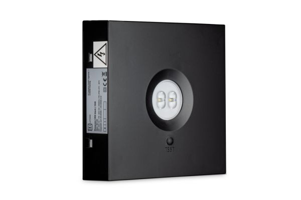 Quadratische Sicherheitsleuchte in minimalistischem Design. Anschluss- und montagefreundliches Kunststoffgehäuse in Verkehrsschwarz, RAL 9017.