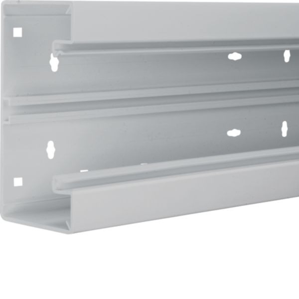 Brüstungskanal-Unterteil aus PVC, 68x170mm, passend zu Oberteil 80mm in Lichtgrau. Erfüllt DIN EN 50085-1. Frontrastender, werkzeugloser Geräteeinbau möglich, zusätzliches C-Profil für erweiterte Einbaumöglichkeiten. Kupplungen, Trennwände und Leitungsrückhalteklammern sind optional einbaubar.