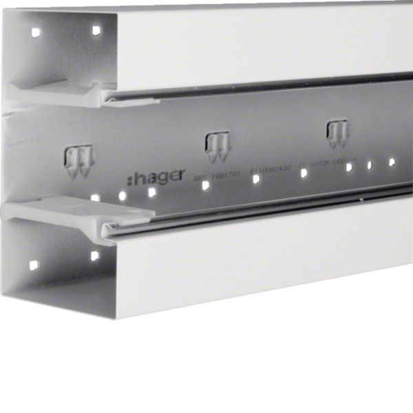 Brüstungskanal-Unterteil aus Stahl, passend zu BRS 100x170mm Oberteil Breite 80mm. Gemäß DIN EN 50085-1, mit Bodenlochung für direkte Wandmontage und Rechtecklochung für Clip-Technik für Konsolen. Ermöglicht werkzeuglosen Geräteeinbau und schnelle Befestigung. Zubehör wie Kupplungen für Potenzialausgleich und Trennwände verfügbar.