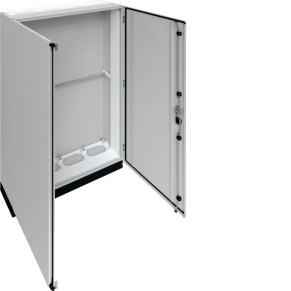 Einzelstandverteiler, univers, für Innenraummontage, Maße: 1850x1050x275mm, Sockelhöhe: 100mm. Konform mit DIN EN 61439-1/-2/-3, DIN 43 870. Niederspannungsverteilung bis 800 Ampere, 3AC 230/400 Volt, 50 Hertz. Schutzart IP Standard 55, Schutzklasse I. Gehäuse aus 1,5 mm Stahlblech, pulverbeschichtet. Features: durchgehende Türdichtung, Schwenkhebelverschluss, vorbereitet für DIN-Profil-Halbzylinder.