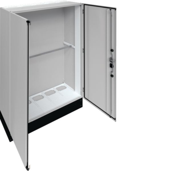Einzelstandverteiler, univers, IP Standard 55, Maße: 1850x1300x400mm + 200mm Sockel. Geeignet für Niederspannungsverteilung bis 800 Ampere, 3AC 230/400 Volt 50 Hertz. Schutzklasse I, Luft- und Kriechstrecken nach DIN VDE 0110-1/-2. Gehäuse aus 1,5 mm Stahlblech, pulverbeschichtet. Inklusive Schwenkhebelverschluss, Türdichtung temperatur- und ölbeständig, Sockelleiste mit abnehmbarer Front.