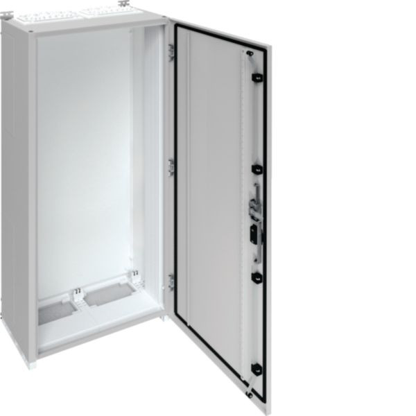 Wandaufbauschrank, univers, IP Standard 55, Schutzklasse II, Maße: 1400x550x275mm. Geeignet für Niederspannungsverteilungen bis 800 Ampere, 3 Wechselstrom, 690 Volt, 50 Hertz. Erfüllt DIN EN 61439-1/-2/-3 und DIN 43870. Ausstattung: pulverbeschichtetes Stahlblech, Durchsteckflansche, ISO-Flanschplatten, Schwenkhebelverschluss. Türdichtung temperatur- und ölbeständig.