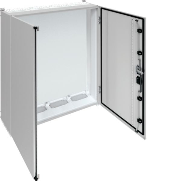 Wandaufbauschrank, univers, IP Standard 55/Schutzklasse II, 1400x1050x275mm, für Innenraummontage, geeignet für Niederspannungsverteilung bis 800 Ampere, 3AC, 690 Volt, 50 Hertz. Ausführung mit pulverbeschichtetem Stahlblech, Schutz gegen Staub und Wasser gemäß IP Standard 55, Luft- und Kriechstrecken nach DIN VDE 0110-1/-2. Tür mit Schwenkhebelverschluss, DIN-Profil-Halbzylinder nachrüstbar, durchgehende Türdichtung, temperatur- und ölbeständig.