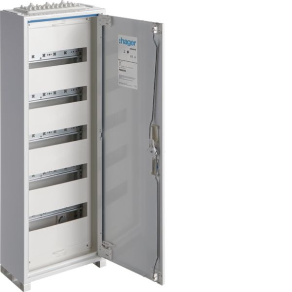 Leitungseinführungen oben und unten, Innenausbau bestehend aus Traggerüst mit Hutschienen und Abdeckungen, je Feld sind PE/N- Schnellsteckklemmen eingebaut Aufputz Feldverteiler, H:800 x B:300 x T:161mm entspricht DIN EN 61 439-1/-3 und DIN 43 870 für Geräte bis 125 A. Er verfügt über Luft- und Kriechstrecken nach DIN EN 60664-1. Der Schrank aus pulverbeschichtetem Stahl bietet Türen mit Dreipunkt-Stangenverschluss und 110° Öffnungswinkel. Ausgestattet mit PE/N-QuickConnect-Klemmen und flexiblen Kunststoffflanschplatten für Leitungseinführungen.