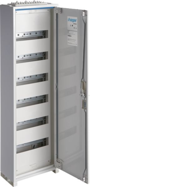 Leitungseinführungen oben und unten, Innenausbau bestehend aus Traggerüst mit Hutschienen und Abdeckungen, je Feld sind PE/N- Schnellsteckklemmen eingebaut Aufputz Feldverteiler, H:950 x B:300 x T:161mm nach DIN EN 61 439-1/-3 und DIN 43 870 für Geräte bis 125 A. Features: Pulverbeschichtetes Stahlblech, Türen bis 2-feldig, profilierte Tragschienen und PE/N-QuickConnect-Klemmen. Mit herausnehmbaren Kunststoffflanschplatten oben/unten, justierbare Scharniere, 110° Öffnungswinkel, Dreipunkt-Stangenverschluss und wechselbare Schließsysteme.