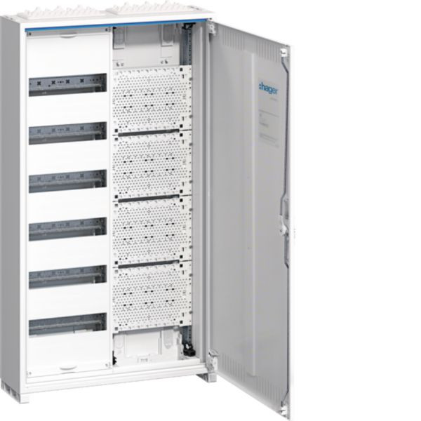 Feldverteiler nach DIN EN 61 439-1/-3! Mit Luft- und Kriechstrecken gemäß DIN EN 60664-1, ideal für Geräte bis 125 A. Ab 800 mm Breite ist er zweitürig. Links sind profilierte Tragschienen, Hutschienen (125 mm Mittenabstand) und PE/N-QuickConnect-Klemmen montiert. Rechts befindet sich das Multimediafeld mit Kunststoffplatten auf profilierten Tragschienen. Innerer Berührungsschutz (SKII) und vertikale Abschottung zwischen Multimedia und Energiefeld für zusätzliche Sicherheit.