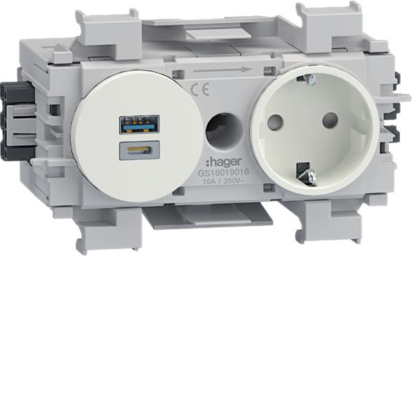 1-fach SCHUKO Steckdose mit integriertem USB-Charger Typ A+C, 15 Watt (5 Volt/3 Ampere). Für Brüstungskanal geeignet, Frontrastende Montage, erhöhter Berührungsschutz. Vorverdrahtet mit Wago Winsta, verpolungssicher. Anschluss via Push-in Klemme für Leiter 1,5-2,5 mm². Modular anreihbar, 60 mm Abstand.