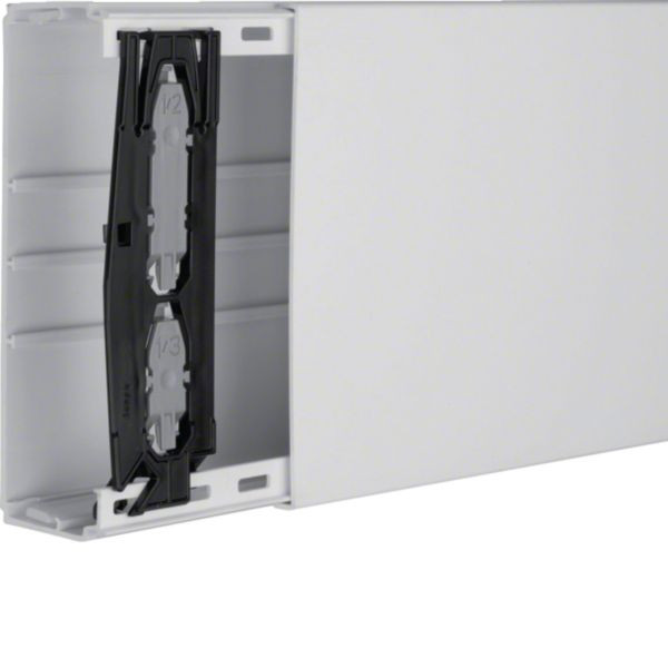 Typen-Endnummer ...1= mit Trennwand Leitungsführungskanal LF 60x190mm aus PVC in Lichtgrau, entspricht DIN EN 50085-1. Features: Trennwand-Einbaumöglichkeiten, einrastbares Kanalunterteil/-oberteil, vorgestanzte Bodenlochung im 125 mm Abstand, vormontierte Kupplungen und Rückhalteklammern. Geeignet für strukturierte Kabelorganisation in Elektroinstallationen.