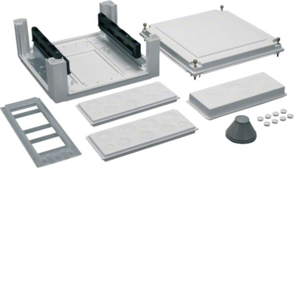 leer incl., 1 Kabelabfangschelle, 1 Tülle M60 = 30 - 45 mm, 2 Flachflansch, 1 Kragenflansch, 1 Buckelflansch, 2 Sammelschienenträger 60 mm, erhöht montiert (SS-Niveau von univers N)