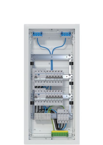 Kleinv.,volta,HWV,4x12PLE,IP30,bestückt u. verdrahtet,2 FI-Kreise,Übersp.ableitInstallations-Komplettkleinverteiler Hohlwand aus Kunststoff, nach DIN VDE 60670-24 und DIN 43871, geeignet zum Einsatz in Wohngebäuden nach DIN 18015. Zum Einbau von Geräten bis 63 A mit 70 mm Einbautiefe nach Maßnorm DIN 43880, Bemessungsspannung 400V/50Hz. Schutzart IP30, Schutzklasse II schutzisoliert. Bestehend aus: Kunststoff-Mauerkasten mit serienmäßigem Leitungsabfang und ausbrechbaren Leitungseinführungsschiebern mit Schnappbefestigung sowie integrierter Wasserwaage. Hohlwandbefestigung mit Schnellfixierungshebel, seitlich oder oben/unten montierbar. Geräteträger aus verzinktem Stahlblech, Hutschienen einzeln isoliert einbaubar. Geräteabdeckung aus Kunststoff mit 46 mm Geräteschlitz, Schnellverschlussbefestigung mit 90° Drehung, serienmäßig plombierbar. Verdrehbarer Blendrahmen mit Tür aus Stahlblech, pulverbeschichtet und eingebrannt, mit 15 mm Putzausgleich. Tür, frontbündig mit innenliegenden handbedienbaren Scharnieren. Türverschluss mit frontbündiger Griffmulde und selbsttätig zurückklappendem Griff, Türanschlag rechts oder links ohne Blendrahmendemontage. Serienmäßige Schaltplanbefestigung in der Tür und sowie integrierter seitlicher Leitungsführungskanal mit Kabelhalteklammern.Bestückt und verdrahtet mit: