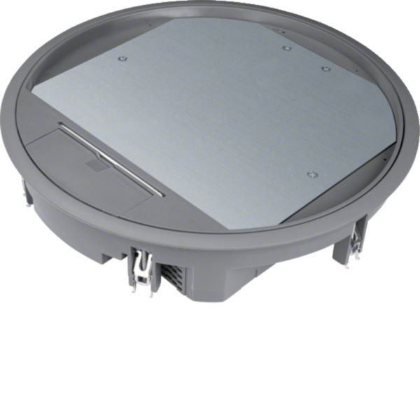 Die Versorgungseinheit R12, rund mit 306 mm Durchmesser, ist speziell für 12 mm Bodenbeläge konzipiert. Einheit aus robustem Polyamid in Eisengrau, entspricht sie den Normen DIN EN 50085-1 und DIN EN 50085-2-2. Der Gerätebecher lässt sich stufenweise bis 18 mm absenken und enthält einen Belagschutzrahmen sowie eine Anschlussmöglichkeit für eine Flachkette. Ideal für Unterflurmontage in Bodeninstallationssystemen. Inklusive Universal-Befestigungsset zur vereinfachten Installation.