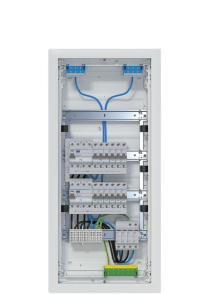 Kleinv.,volta,UPV,4x12PLE,IP30,bestückt u. verdrahtet,2 FI-Kreise,Übersp.ableitInstallations-Komplettkleinverteiler Unterputz aus Kunststoff, nach DIN VDE 60670-24 und DIN 43871, geeignet zum Einsatz in Wohngebäuden nach DIN 18015. Zum Einbau von Geräten bis 63 A mit 70 mm Einbautiefe nach Maßnorm DIN 43880, Bemessungsspannung 400V/50Hz. Schutzart IP30, Schutzklasse II schutzisoliert.Bestehend aus: Kunststoff-Mauerkasten mit serienmäßigem Leitungsabfang und ausbrechbaren Leitungseinführungsschiebern mit Schnappbefestigung, integrierter Wasserwaage und verzinkten Stahlblech-Befestigungslaschen. Geräteträger aus verzinktem Stahlblech, Hutschienen einzeln isoliert einbaubar. Geräteabdeckung aus Kunststoff mit 46 mm Geräteschlitz, Schnellverschlussbefestigung mit 90° Drehung, serienmäßig plombierbar. Verdrehbarer Blendrahmen mit Tür aus Stahlblech, pulverbeschichtet und eingebrannt, mit 15 mm Putzausgleich. Tür, frontbündig mit innenliegenden handbedienbaren Scharnieren. Türverschluss mit frontbündiger Griffmulde und selbsttätig zurückklappendem Griff, Türanschlag rechts oder links ohne Blendrahmendemontage. Serienmäßige Schaltplanbefestigung in der Tür und integrierter seitlicher Leitungsführungskanal mit Kabelhalteklammern. Fingersichere PE/N-Klemme mit Stecktechnik in montagefreundlicher Schnapptechnik und N-Klemme für FI-Kreise serienmäßig.