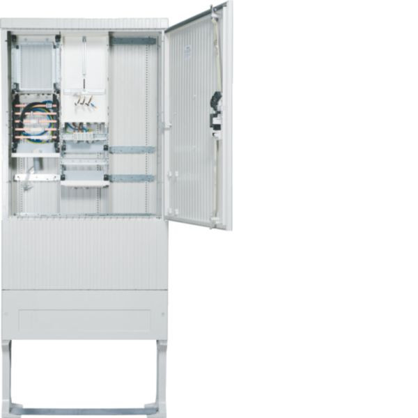 Die Zähleranschlusssäule 207 univers Z, 1 Zählerplatz, 3-Punkt, 5-polig, mit Leerfeld bietet eine Schutzart IP Standard 44 und besteht aus glasfaserverstärktem Polyester nach DIN EN 14598. Sie entspricht den Normen DIN VDE 0603-1 und DIN VDE 0603-2-1 sowie der VDE-AR-N 4100. Das Gehäuse ist für den Außeneinsatz konzipiert, mit einem profilierten Rippendesign und einer Tür, die bis zu 180 Grad geöffnet werden kann.