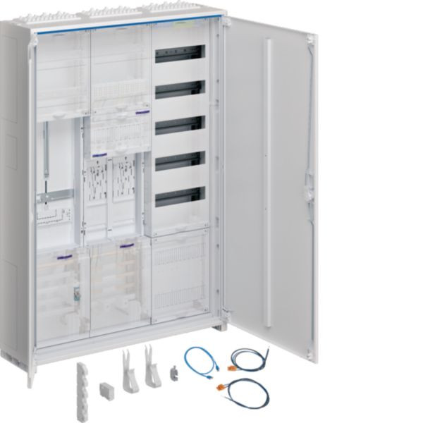 Der Zähler-Komplettschrank, univers Z, bietet zwei Zählerplätze und einen Steuerungsplatz. Ausgestattet mit BKE-I, OKK und APZ, unterstützt er die Verteilertechnik VT5. Mit einer Höhe von 1100mm und 3-feldriger Ausführung, ermöglicht er eine effiziente Installation und Wartung. Ideal für Aufputz-Montage, gewährleistet er hohe Funktionalität und Sicherheit in der Energieverteilung.