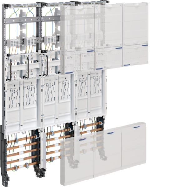Technische Merkmale: Zähleraufnahme eHZ System, 6 Zählerplätze = 63 A, 3 Zählerfelder (Einbausätze), 3 Felder, Netzform TN-S, Verdrahtung 5-polig, Sammelschienendicke 5 mm, Sammelschienenhöhe 12 mm, Sammelschienenabstand 40 mm, Leitungsquerschnitt Zählerzugangsleitung 10 mm², Leitungsquerschnitt Zählerabgangsleitung 10 mm², Ausstattung Zählerplatz mit BKE-Datenschnittstelle, Ausstattung UAR Zählerfeld mit Sammelschienen 5-polig, Hauptgerät UAR Zählerfeld für Einbau von selektivem Hauptleitungsschutzschalter, Zusatzgerät UAR Zählerfeld leer, Hauptgerät OAR Zählerfeld Hauptleitungsabzweigklemme 3-polig, berührungssicher bis 25mm², Zusatzgerät OAR Zählerfeld leer, PE/N-Klemmen OAR Zählerfeld Schraubklemmen 4x5 Klemmstellen, Ausstattung OAR SG/TRE-Feld ohne Bestückung, Anzahl Hutschienen 9
