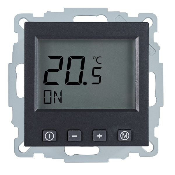 Fußbodenheizungsregler u.P. Digital, zur Regelung der Fußbodentemperatur unabhängig der Raumtemperatur, ohne Zeitschaltuhr, großes, beleuchtetes Display, einschl. Zentralscheibe, ohne Abdeckrahmen, einfache Bedienung, Ist- und Solltemperaturanzeige, 10(4)A, 230V, einschl. Fühler (NTC, 33kOhm bei 25°C) mit 4,00 m Leitung, ohne Fühlerhülse, Umstellmöglichkeit auf Heizen/Kühlen-Funktion und auf Schließerkontakt, Farbe: anthrazit matt (lackiert), passend in folgende Schalterprogramme: Gira System 55, Berker Serie S.1 / B.3 / B.7, Merten Serie System M